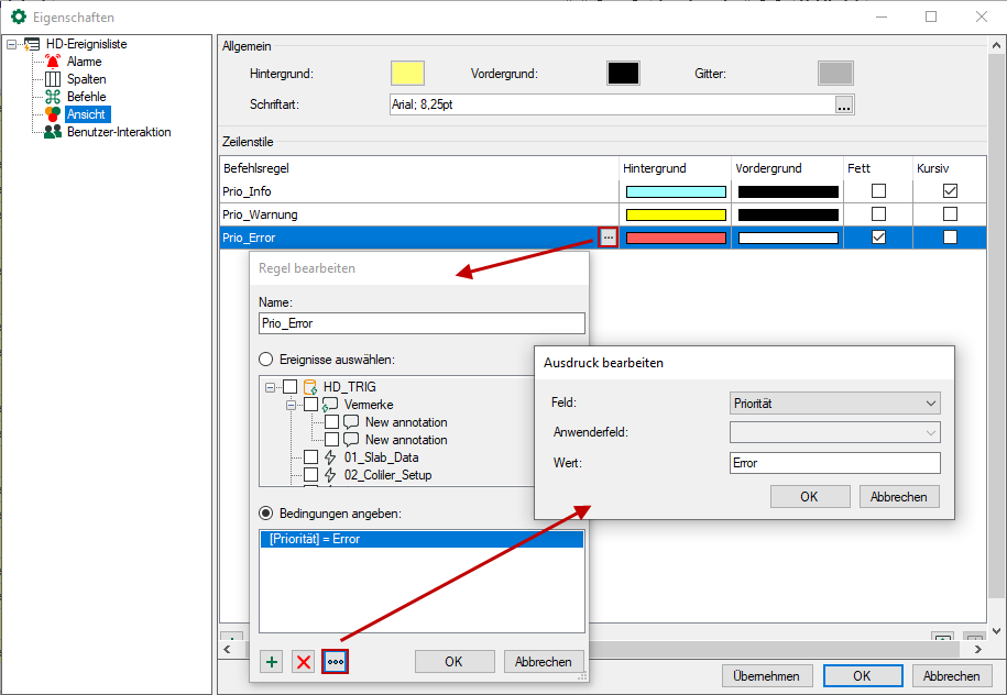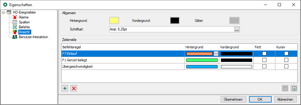 In der Rubrik "Ansicht" bei den Eigenschaften der Ereignisliste richten Sie solche Zeilenstile lokal auf dem ibaPDA-Client ein.