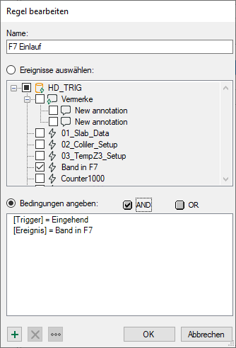 Wenn eine Bedingung mehrere Ausdrücke enthält, dann werden diese mit einem logischen UND bzw. ODER verknüpft. Im Dialog Ausdruck bearbeiten wählen Sie zunächst ein Feld (z. B. Ereignis, Kommentar, Trigger usw.) und anschließend einen Wert aus (z. B. Ereignisname, Klartext, eingehend/ausgehend usw.)