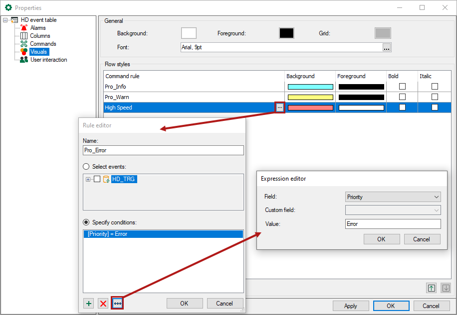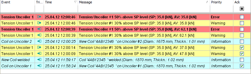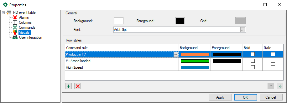 Similar to the commands (see above), the style of the rows in the event table can be controlled, depending on the properties of the occurred event.