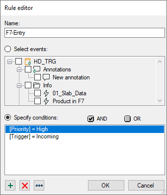 If a condition contains several expressions, then these will be linked with a logical AND or OR. In the Edit expression dialog, first select a field (e.g. event, comment, trigger, etc.) and then a value (e.g. event name, plaint text incoming/outgoing, etc.)