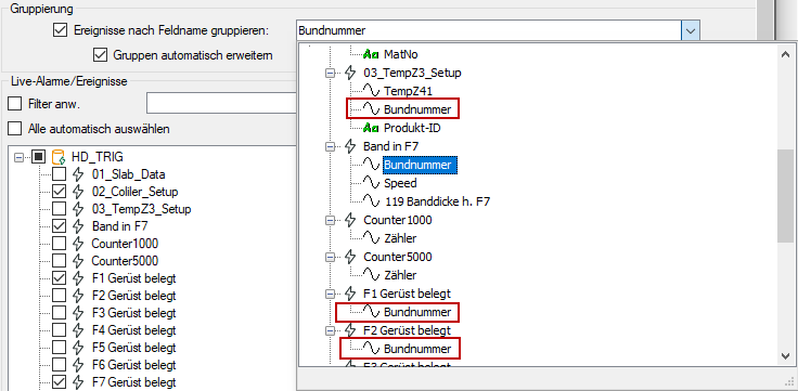 Dort werden alle konfigurierten Ereignisse mit ihren Feldern aufgelistet. Wählen Sie das gewünschte Feld für die Gruppierung aus und klicken Sie auf <Übernehmen> oder <OK>.