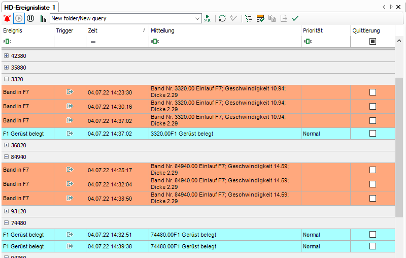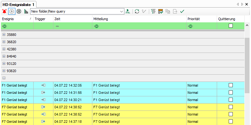 Sie können die Gruppen nach Bedarf einzeln minimieren oder erweitern. Im Kontextmenü der Ereignisliste können Sie alle Gruppen minimieren oder erweitern. Im Eigenschaftendialog können Sie konfigurieren, ob die Gruppen automatisch erweitert werden sollen.