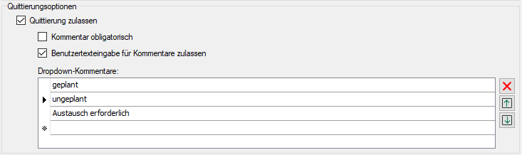 In diese Liste können Sie Quittierungskommentare eintragen, die dann bei der Quittierung in der Drop-down-Liste zur Auswahl stehen. Mit den Pfeilsymbolen rechts neben der Liste können Sie die Reihenfolge der Kommentare ändern. Mit dem Entfernen-Symbol entfernen Sie den Kommentar, in dem der Cursor steht.