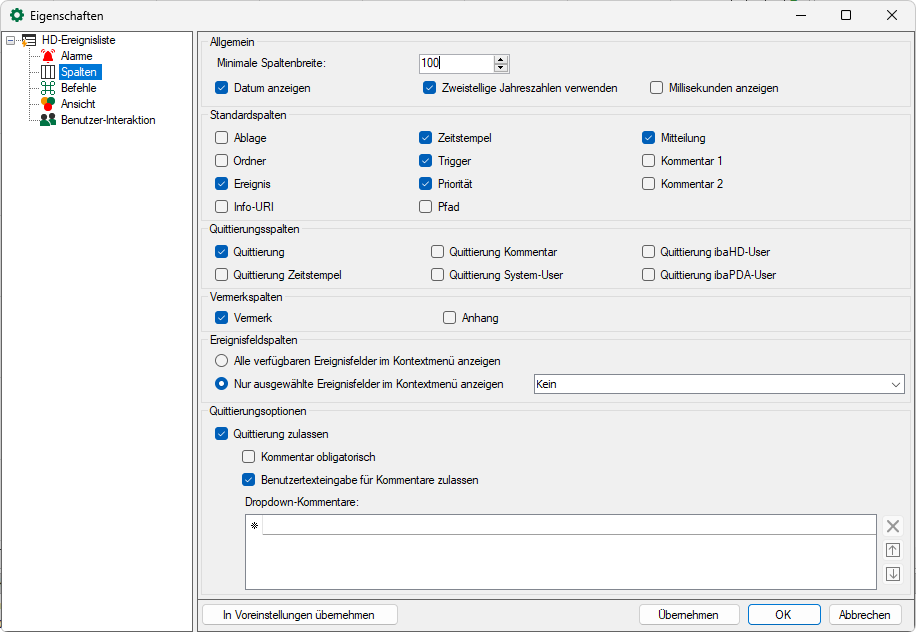Hier können Sie auswählen, welche Spalten in der Ereignisliste angezeigt werden sollen und welche nicht. Neben den Standardspalten können Sie noch spezielle Spalten für Quittierung und Vermerke aktivieren bzw. deaktivieren.