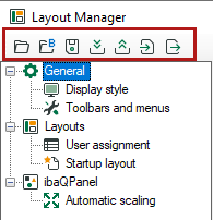 In the topmost toolbar of the Layout Manager you’ll find the buttons for loading and importing of stored layouts as well as saving and exporting of new or changed layouts.