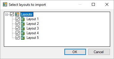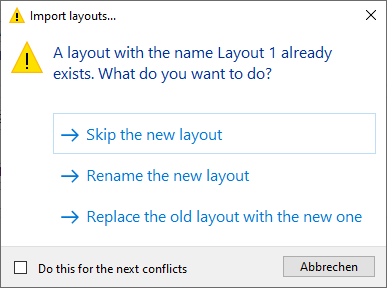 Layouts will be imported from a layout file in the file system and added to the currently available layouts. These can be old layout files (*.lay) or layout files of the current version (*.layout, *.layouts). The layouts to be imported can be selected from the layout collection in a dialog. ![]() If a layout to be imported already exists (same name) a dialog opens to resolve the conflict. ![]()