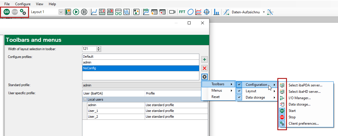 The following figure depicts for example a reduced toolbar, where the buttons for configuration of server, I/O Manager and data storage have been hidden. This setting has been saved as profile "NoConfig" and assigned to User_1 and User_2.