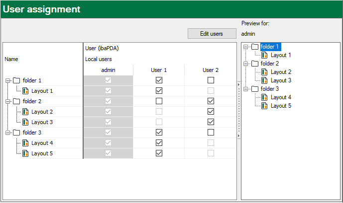 You can assign each user the layouts individually by checkmarks. When assigning layouts in folders, the folder must be assigned too. Even if you have assigned a folder, the desired layouts in the folder must be assigned too.