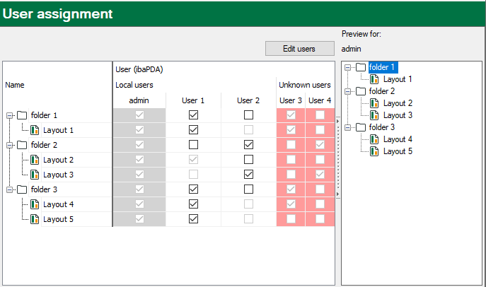 On the right side there is a preview window, showing what the selected user would see in the layout selection box in the toolbar of ibaPDA client. You can hide the preview window in order to have more space for user assignment. Simply click on the control on the border between table and preview window.