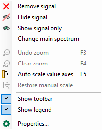 Clicking on “Remove signal” removes the corresponding signal. Clicking on “Hide signal” hides the signal and shows the signal name transparently. The signal is only temporarily hidden and can always be displayed again. By clicking on "Show signal only” in the context menu, only the selected spectrum remains in the display and all other spectra are hidden. Clicking on “Change main spectrum” makes the selected spectrum the main spectrum.