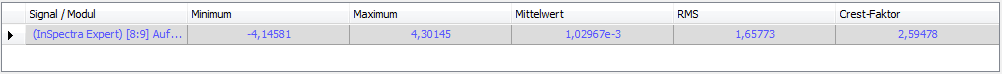Die Zeittabelle zeigt die gleichen statistischen Werte des Eingangssignals an, die oben als Zeitparameter bezeichnet wurden.
