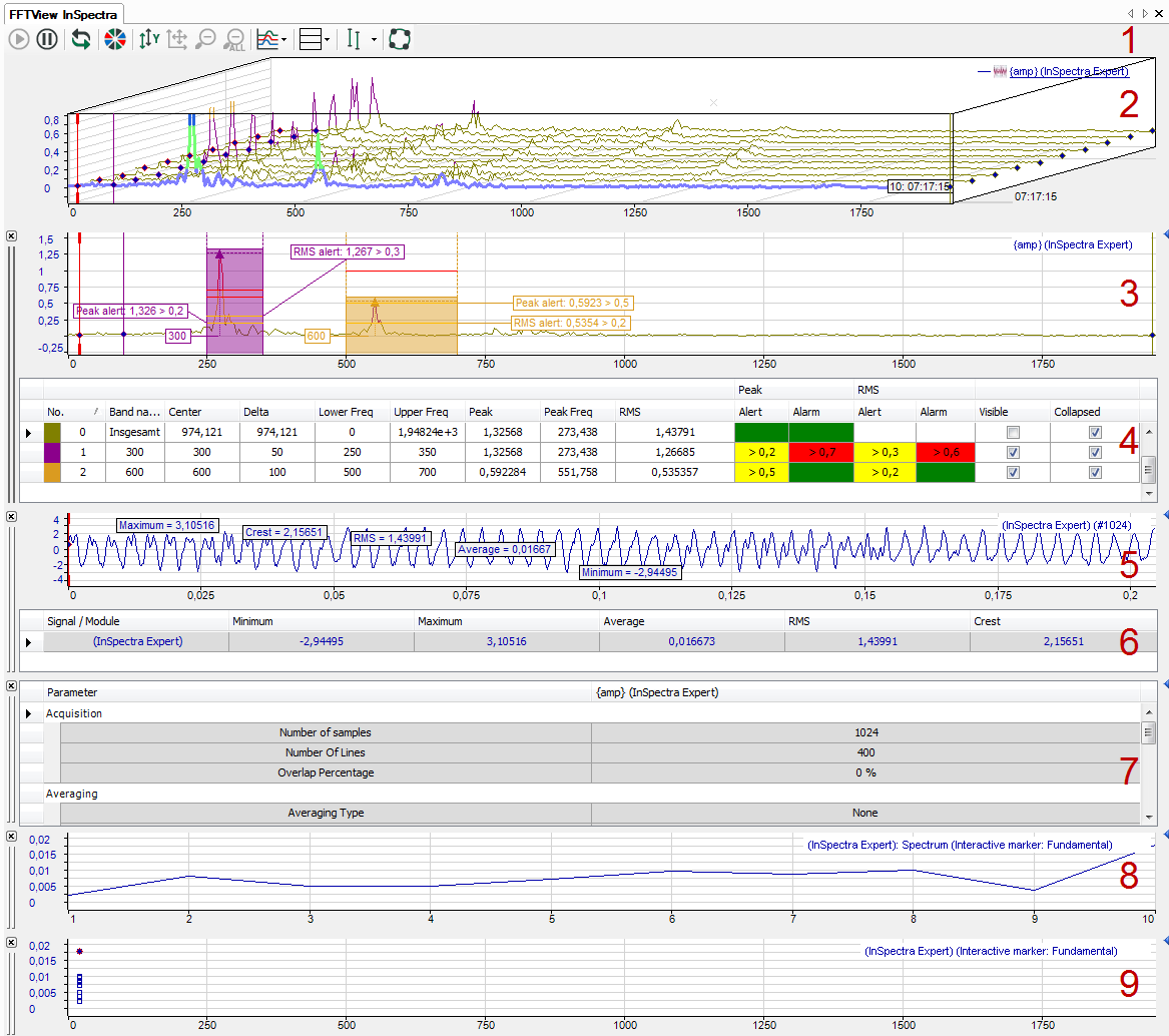 The main window is always displayed at the top. The additional windows for graphs and data of spectrum and time domain are grouped in pairs. In analogy to normal trend views, their position can be changed at the header bar by using the mouse. You can display or hide the individual graphs and tables within the FFT view by means of the buttons as shown in the above figure.