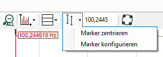 Da der Marker an einer bestimmten Position auf der Frequenzachse steht, kann es vorkommen, dass er nach Zoom-Aktionen nicht mehr im Bild zu sehen ist. Ein Aus- und Einschalten des Markers, um ihn wieder ins Bild zu bringen, nützt nichts, da er seine Position deswegen nicht verändert.