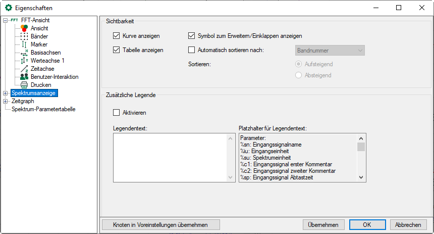 Allgemeine Anzeigeeigenschaften definieren Sie im Eigenschaftendialog der FFT-Ansicht im Knoten Spektrumsanzeige.