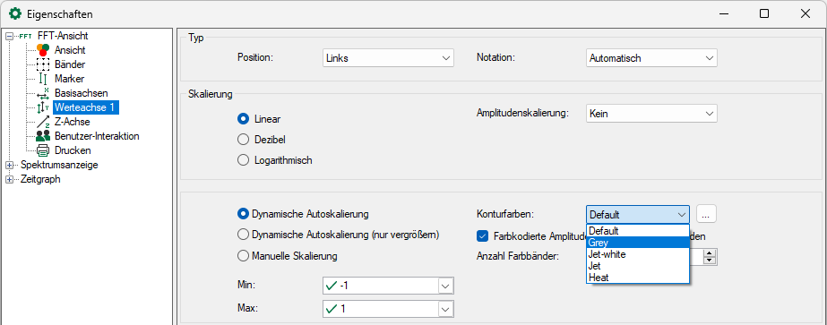 Die Konfiguration des Farbschemas kann in den Eigenschaften der Werteachse vorgenommen werden. Hier können sowohl vordefinierte Schemen ausgewählt als auch eigene Farbschemen erstellt werden.