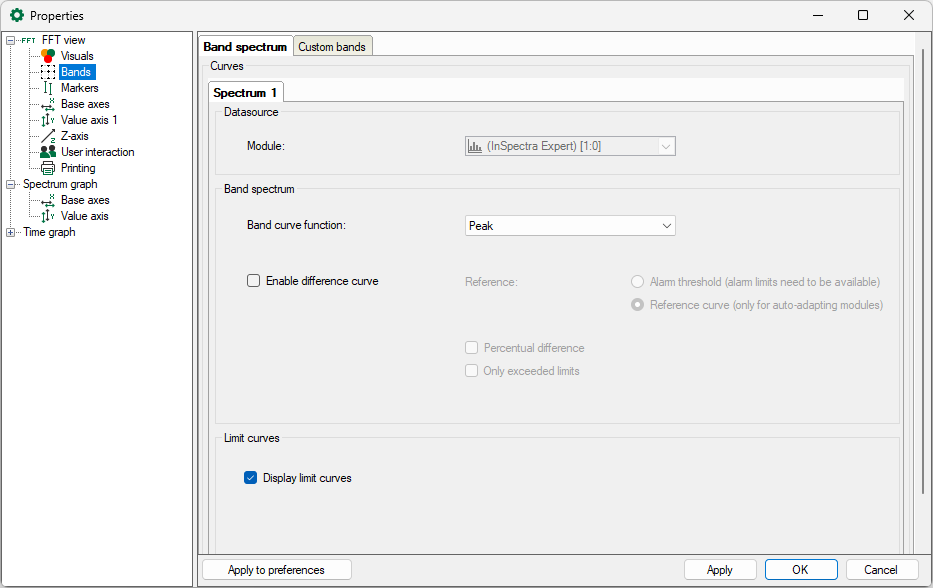 Enable this option to show the limit curves in the FFT view. A limit curve interconnects all band limits of the same type (warning, alarm, lower or upper).
