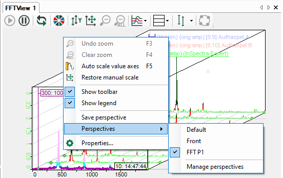 If you have set the desired perspective, you can save it. To do this, select Save perspective in the context menu and enter a name. Saved perspectives also appear in the context menu and can be re-enabled at any time. When you select Front perspective, the display pans to 0 degrees. Selecting Default returns you to the default setting. See also chapter Properties and preferences FFT view