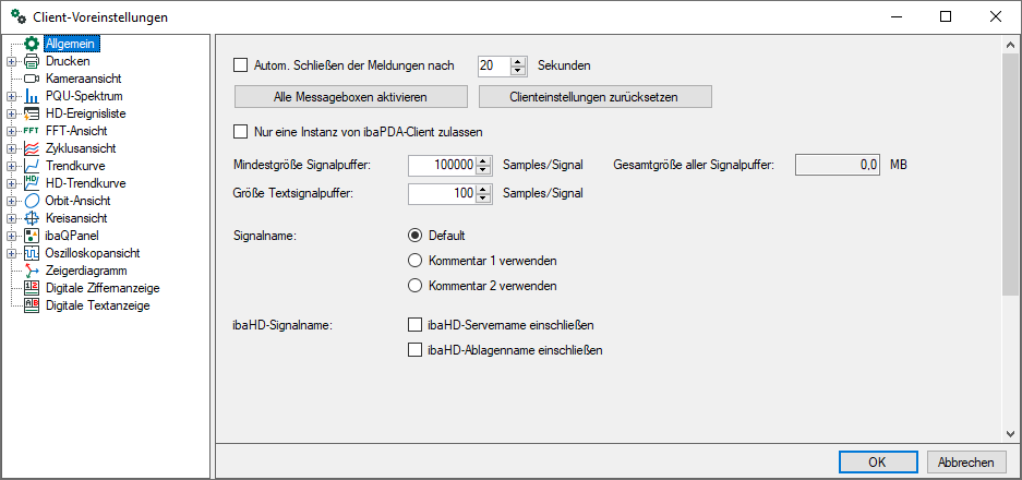 Diese Einstellungen legen die Größe eines jeden Signalpuffers, bzw. Textsignalpuffers, in einem ibaPDA-Client fest. Der Signalpuffer enthält eine Reihe von Messungen, die einer bestimmten Zeit, bezogen auf die Messzeit entsprechen. So wird z. B. beim eingestellten Standardwert von 100000 der ibaPDA-Client eine Trendkurve über 100 Sekunden für ein Signal mit der Messrate 1 ms anzeigen. Möchte Sie den angezeigten Zeitraum über die X-Achse z. B. auf 10 Minuten ausdehnen, so müssen Sie die Puffergröße entsprechend anpassen.
