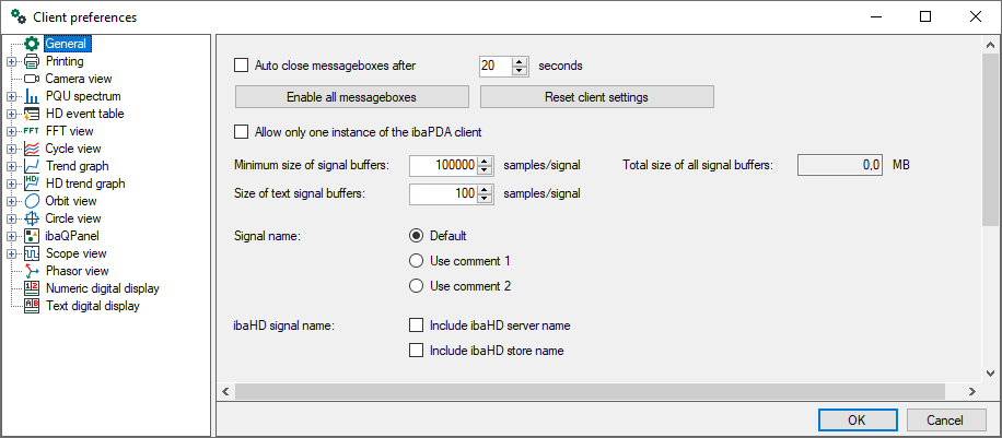 These settings determine the size of each signal buffer, or text signal buffer, on an ibaPDA client. The signal buffer contains a number of samples corresponding to a certain time with regard to the sample time. A setting like the 100000 default value, for example, will enable the ibaPDA client to show a trend graph for 100 seconds for a signal sampled with 1 ms. If you would like to see a longer period over the x-axis, e. g., 10 minutes, you should increase the buffer size accordingly.
