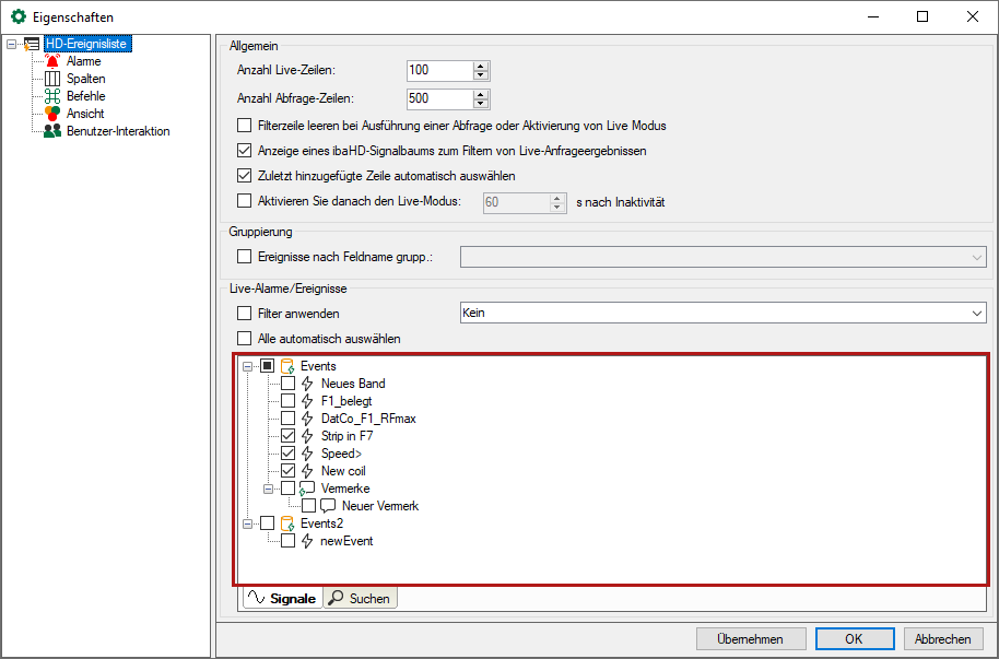 Der Ereignisbaum (siehe roter Rahmen in der Abbildung oben) ist nur in den Eigenschaften einer Ereignisliste verfügbar.