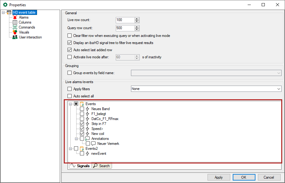 The event tree (see red frame in figure above) is only available in the properties of an event table.