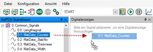 Ziehen Sie ein Signal aus dem Signalbaum in das Digitalanzeige-Panel und lassen Sie es fallen. Eine digitale Ziffernanzeige, die den Istwert anzeigt, wird automatisch hinzugefügt.