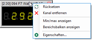 Um eine Digitalanzeige individuell einzurichten, den Bereichsbalken zu aktivieren/deaktivieren und die Minimal-/Maximalwerte für einen Reset einzustellen, klicken Sie mit der rechten Maustaste auf eine Anzeige und öffnen das Kontextmenü.
