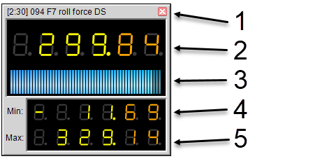 Eine digitale Ziffernanzeige gibt den Istwert eines Analogsignals wieder. Optional kann zusätzlich die Anzeige von Minimal- und Maximalwert eines Signals gewählt werden (rücksetzbar). Ein Bereichsbalken kann angezeigt werden, der die Position des aktuellen Werts zwischen dem minimalen und maximalen Signalwert zeigt. Minimal- und Maximalwert, sowie der Bereichsbalken können im Kontextmenü aktiviert/deaktiviert werden. Die digitalen Ziffernanzeigen können frei schwebend positioniert oder in einem Digitalanzeige-Panel angedockt sein. Größe, Stellenzahl und Farbe der Werteanzeige lassen sich konfigurieren.
