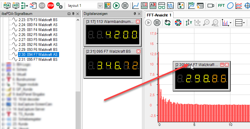 Wenn Sie die Digitalanzeige an einer anderen Stelle als schwebendes Fenster positionieren möchten anstatt sie an ein Digitalanzeige-Panel anzuhängen, dann ziehen Sie sie einfach aus dem Digitalanzeige-Panel heraus. Dadurch können Sie die Digitalanzeige z. B. über die Signalstreifen bewegen.