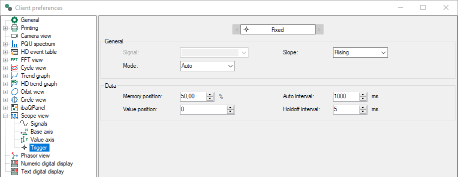 In the "Preferences" dialog, you can set the general options for the trigger, such as the mode (normal, single, auto and auto level) and trigger edge (rising, falling, both and alternating). The signal selection is disabled. The signal for controlling the trigger can be selected in the view's "Properties" dialog.