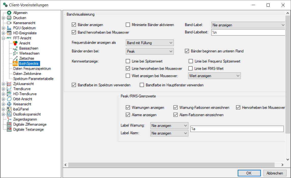 Der Dialog Client-Voreinstellungen gleicht sich mit dem Dialog Eigenschaften für InSpectra-Bänder. Beschreibung siehe Kapitel Bänder