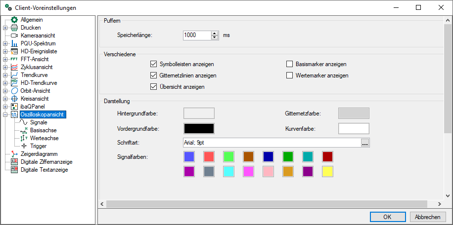 Stellen Sie hier, wie bei der Trendansicht, ihre bevorzugten Farben für die verschiedenen Bereiche der Oszilloskopansicht ein.