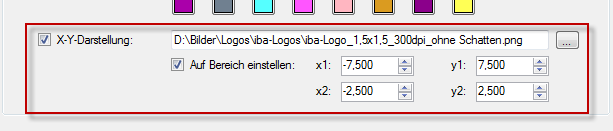 • Die Option "Auf Bereich einstellen" erlaubt es, die Größe und Position des Hintergrundbildes zu definieren. Indem Sie die Koordinaten x1/y1 und x2/y2 bestimmen, können Sie die 4 Ecken des Bildes auf die X/Y-Skalen innerhalb der Ansicht ausrichten.