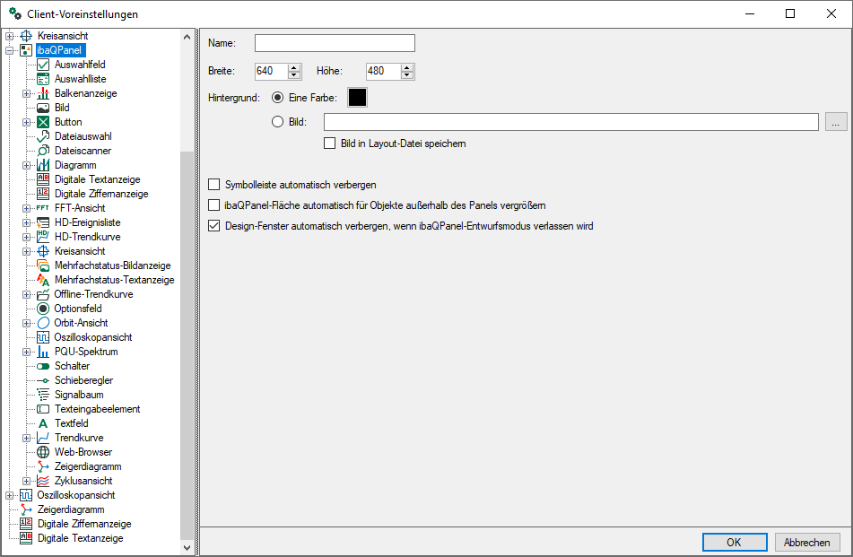 Wie in ibaQPanel beschrieben, ist die Ansicht von ibaQPanel die Basis für eine HMI-ähnliche Bildschirmgestaltung. Neben speziellen QPanel-Objekten, wie z. B. Mehrfachstatus-Label, Mehrfachstatus-Grafik, Schaltfläche, Label, Balkendiagramm, Instrumententafel und Texteingabesteuerung, können Sie alle anderen Arten von Ansichten einer QPanel-Ansicht hinzufügen. Folglich sind Einstellmöglichkeiten für Voreinstellungen und Eigenschaften dieser Objekte innerhalb der Voreinstellungen und Eigenschaften vom QPanel verfügbar.