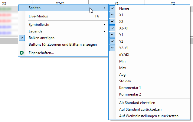 Wenn Sie eine Einstellung gefunden haben, dann können Sie diese als neue Standardeinstellung mit Als Standard einstellen abspeichern. Wenn Sie temporär Änderungen vorgenommen haben, dann können Sie jederzeit mit Auf Standard zurücksetzen auf die zuletzt als Standard gespeicherte Einstellung zurückgehen. Schließlich können Sie die Spalteneinstellungen auch wieder auf den Auslieferungszustand zurücksetzen (Werkseinstellungen).
