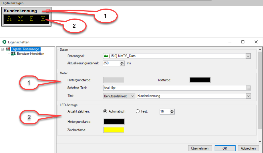 Hinsichtlich der grundsätzlichen Bedienung ähnelt dieses Element der digitalen Ziffernanzeige (siehe Digitale Ziffernanzeige). Auch die digitale Textanzeige können Sie über das Menü Ansicht oder die Symbolleiste hinzufügen und in ibaQPanel verwenden.