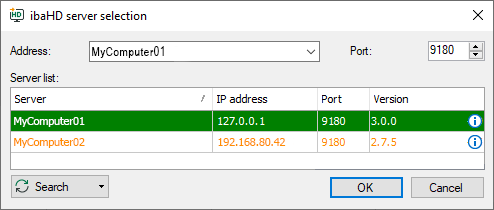 Use the <Search> button to scan the network for active HD servers and select a server from the table or type in a server address. Click the <OK> button to connect to the ibaHD-Server. If the HD signal tree has not been visible yet, it will be shown automatically in the ibaPDA client.