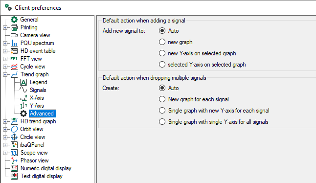 The advanced options allow you to change the behavior when adding signals to a trend graph by either double-clicking in the signal tree or by drag and drop. The "Advanced" branch is only available in the preferences.