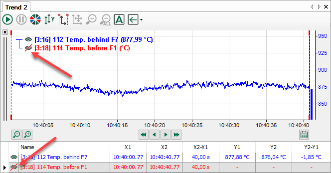 Wenn Sie Signale in einer Trendkurve nicht entfernen sondern nur vorübergehend ausblenden wollen, können Sie die Funktion zum Verbergen und Anzeigen eines Signals nutzen.