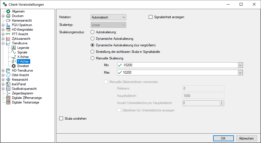 Dynamische Autoskalierung: Wenn Sie diese Option aktivieren, dann wird die Skalierung stets den höchsten und niedrigsten Signalamplituden im Graphen angepasst (in beide Richtungen)