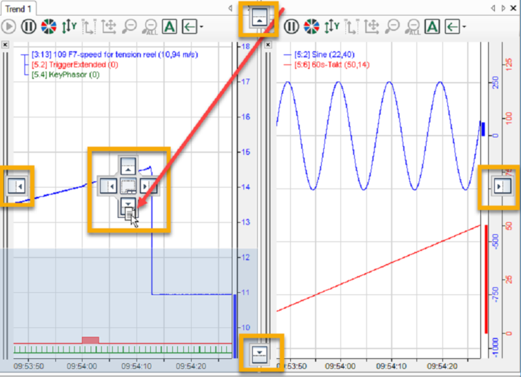 All visible windows in the ibaPDA user interface are dockable windows. So are the signal monitors (views). You can move, drag or squeeze the views as you like. Or they can be arranged on top of one another as tabs.