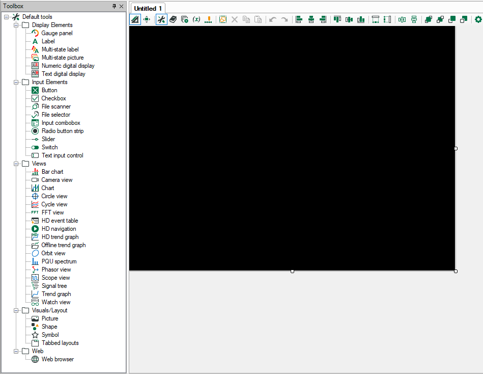 The new QPanel view opens in the design mode and the toolbox containing all types of display objects is displayed.