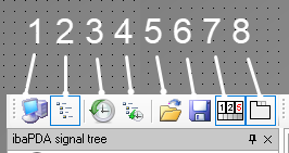 This defines whether the special ActiveX toolbar is displayed (Yes or No). The functions of this toolbar can only be used in runtime mode. 1 Select ibaPDA-Server 2 Show/hide ibaPDA signal tree 3 Select ibaHD-Server 4 Show/hide ibaHD-Server signal tree 5 Open layout, loads a layout from a file 6 Save layout, saves the current layout in the file specified above 7 Show/hide window for digital displays 8 Show/hide view tabs Changing this property via a script at runtime will immediately take effect. |