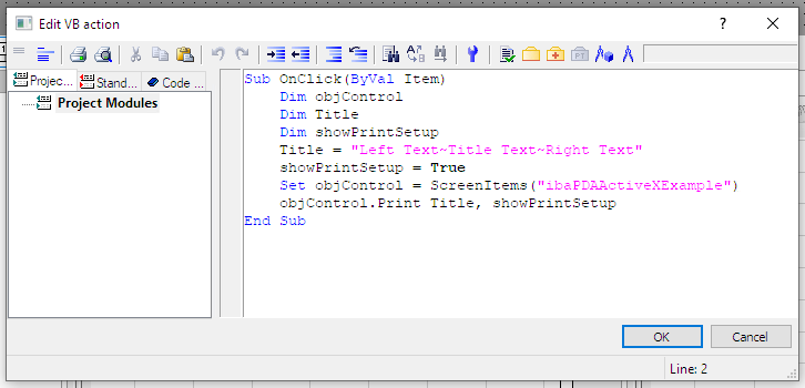 The following is an example of a VBScript in SIMATIC WinCC that can be programmed as a Mouse Click Event using a button, for example. In this case, "ibaPDAActiveXExample" is the object name of the ibaPDA ActiveX control in SIMATIC WinCC