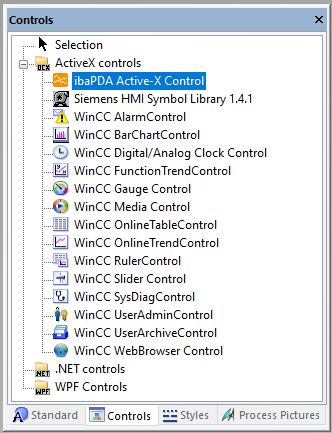 Öffnen Sie das Fenster mit den Steuerelementen ("Controls"). Falls noch kein ibaPDA ActiveX Control enthalten ist, müssen Sie dies zunächst hinzufügen. Wenn das Control bereits vorhanden ist, fahren Sie bei Schritt 5) fort.
