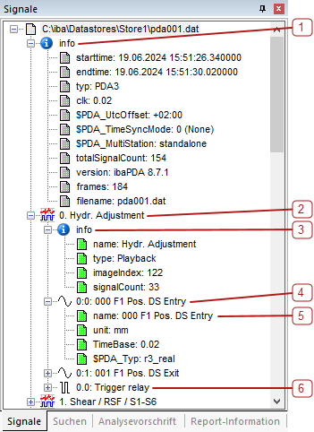 Der Inhalt der Messdatei erscheint im Signalbaumfenster. Prozesssynchrone Erfassungssysteme wie ibaPDA speichern in der Messdatei neben den eigentlichen Messwerten auch noch zusätzliche Informationen ab, die in ibaAnalyzer angezeigt und ausgewertet werden können.