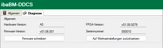 Im Register Diagnose sehen Sie die aktuellen Versionsinformationen und die Seriennummer des Gerätes.