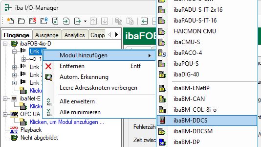 Klicken Sie mit der rechten Maustaste auf den Link und wählen Sie Modul hinzufügen - ibaBM-DDCS.