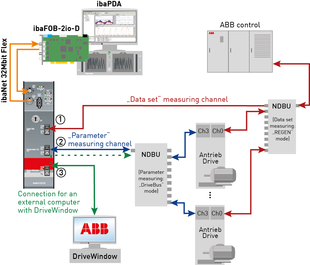Furthermore, ibaBM-DDCS offers a connection to loopthrough configuration and measurement queries of an external computer with DriveWindow. The DriveWindow computer is connected to the drives via the parameter channel if needed. Duplex fiber optic connection between ibaBM-DDCS X34/X35 and the DriveWindow computer.