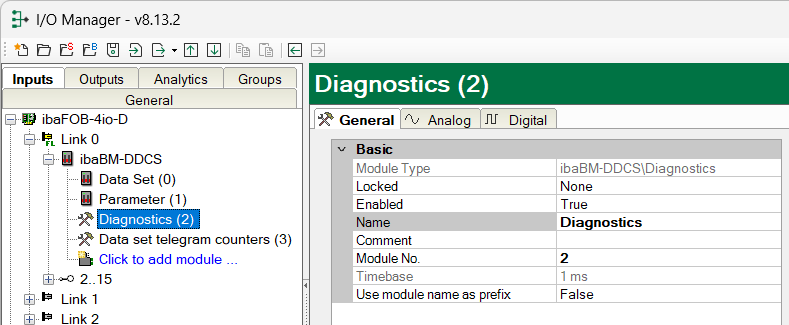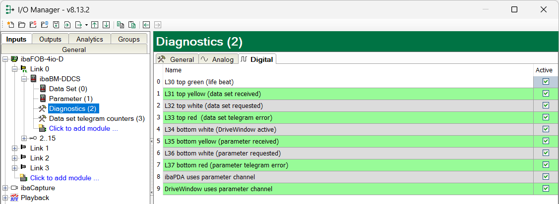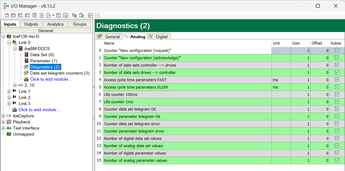 Beginning with ibaPDA version 6.35, the diagnose data is pre-defined by ibaPDA. In ibaPDA version 6.34 or older, the user had to manually enter the diagnose data. In this case, the number of analog and digital signals had to be entered in the General tab and the diagnose values with address and designation had to be manually entered in the Analog and Digital tabs. For an easier configuration, pre-configured diagnose modules for the most important diagnostic data were available on the data medium “iba Software & Manuals”, which is included in delivery. The modules could be imported in the I/O Manager. - Module 290: diagnostic counter for data set telegrams drive 1 – 16 - Module 291: diagnostic counter for data set telegrams drive 17 – 32 - Module 299: general diagnostic values, counter, error displays |